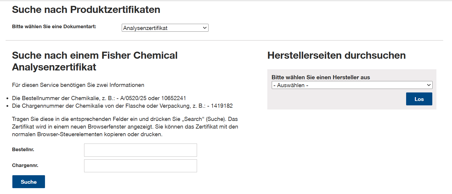 Sie können Analysenzertifikate auf der Website von Fisher Scientific mit unserer Suchfunktion für Analysenzertifikate finden.