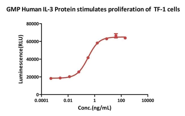 | Biological Activity | GMP Human IL-3 Protein (Cat. No. GMP-L03H18) stimulates proliferation of TF-1 cells. The specific activity of GMP Human IL-3 Protein is >1.00x10^6 IU/mg, which is calibrated against human IL-3 WHO International Standard (NIBSC code: 91/510) (QC tested).∣The activity of GMP Human IL-3 (Cat. No. GMP-L03H18) was higher than other competing products.∣GMP Human SCF Protein (Cat. No. GMP-SCFH25), Human Flt-3 Ligand Protein (Cat. No. GMP-FLLH28), GMP Human IL-3 Protein (Cat. No. GMP-L03H18) and GMP Human IL-6 Protein (Cat. No. GMP-L06H27) could support the rapid cell expansion and good cell viability of CD34+ hematopoietic stem cells.∣The Cell based assay shows that GMP Human IL-3 Protein (Cat. No. GMP-L03H18) is stable at 37°C for 24 hours.∣The Cell based assay shows that GMP Human IL-3 Protein (Cat. No. GMP-L03H18) is stable at 4°C for 180 days.∣The Cell based assay shows that GMP Human IL-3 Protein (Cat. No. GMP-L03H18) is stable after freezing and thawing 3 times.∣The Cell based assay shows batch-to-batch consistency between Acro's GMP and PG IL-3.∣MALDI-TOF analysis of GMP Human IL-3 Protein (Cat. No. GMP-L03H18). The labeled peaks at 15209.9 Da and 15080.7 Da correspond to the calculated molecular mass with the N-terminal Met (15213 Da), and without the N-terminal Met (15081 Da), respectively. The minor peak following the major peak is a matrix-associated artifact of the MALDI-TOF (Routinely tested). |